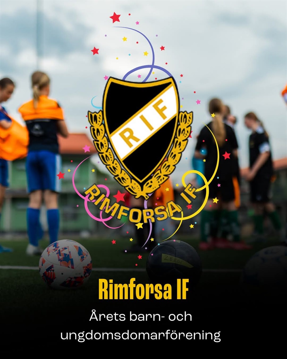 "Rimforsa IF utses till Årets barn- och ungdomsdomarförening för sitt fina arbete med att utbilda och utveckla egna domare. Föreningen är självförsörjande på ungdomsdomare i 5 mot 5 och 7 mot 7 och tar dessutom fram domare som går vidare inom ÖFF:s regi till 9 mot 9 och 11 mot 11.